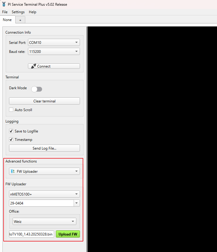4) In the left section of the PI Service Terminal, locate 'Advanced functions' and choose 'FW Uploader' from the drop-down menu: